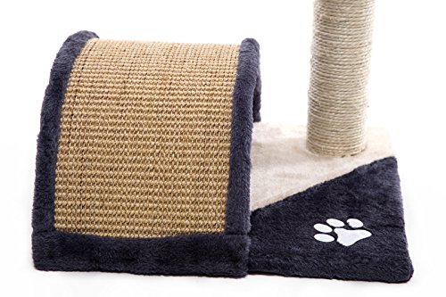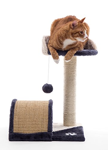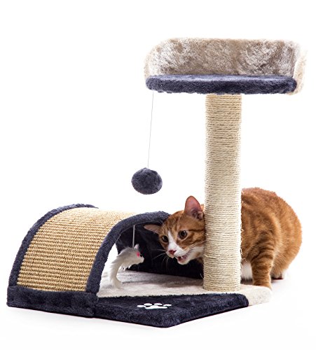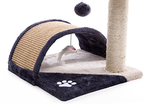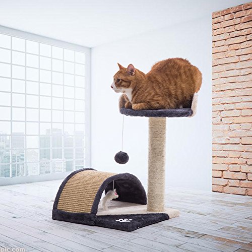 Features: Sturdy, safe and stable construction 2-tier desigh allows the cats to jump around 1 sisal rope covered posts for cats to scratch and climb A sisal bridge tunnel for cats to rest and play a toy mouse and dangling pom-pom ball for the cats to play with
