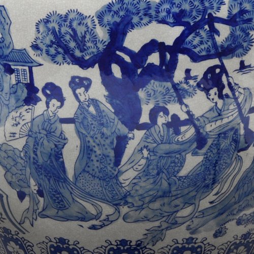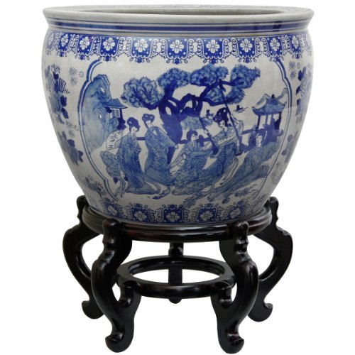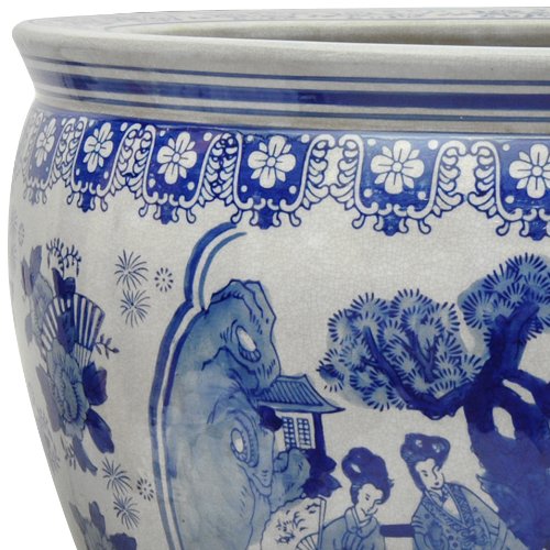 Oriental Furniture 14" Ladies Blue & White Porcelain Fishbowl