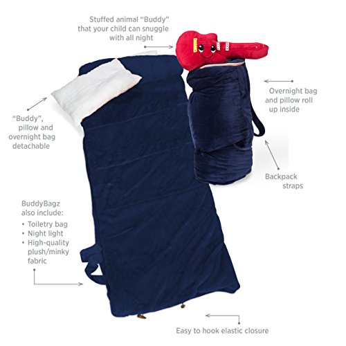 THE ONE-STOP TRAVELING SOLUTION FOR YOUR KIDS: BuddyBagz’s sleeping bag is essentially an all in one travelling/camping/overnight kit that has all a kid can need in a super fun & easy to use design. Complete with a fuzzy stuffed animal, a pillow, a sleeping bag, a night light, a toiletry bag and an overnight bag, it’s all a kid needs for a comfortable sleep away from home, without tears!