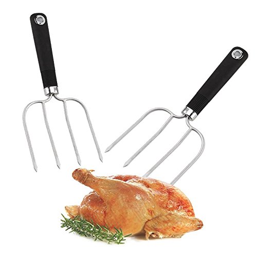 - Set of 2 Turkey fork made of Food Grade Stainless Steel and Black Slip Resistant Grip, 4 sharp prongs for easy to hold the meats and the wide spread prongs make the turkey stable