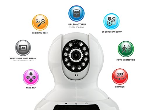 -. Feature : CAMERA: High-definition (1280x720) IP camera that allows you to monitor your home or business wirelessly. Fully adjustable design allows for 120 degree tilting and 355 degree rotation to point your camera in any direction. Control the monitor with an easy to use app / SIMPLE SETUP: Plug and play. Plug in your camera and launch the app on your phone, scan the special QR code on your camera, make a password, and you are done. Installation takes mere minutes and you will have access to state of the art monitoring technology with password protected video feeds / INTERCONNECTED: Add as many camera as you want, set Wi-Fi and watch live feed of your camera connected to the networks. Night vision capabilities allow for crystal clear night vision up to 32 feet. Two way audio system will also capture any audio within the same range / MEMORY: MicroTF Slot that supports a 64 GB SD Card. This camera provides H. 264 compression, which allows for HD quality video with smaller file sizes when recording video. This allows you to store anywhere from 3 - 5 times as much video compared to MJPEG compression cameras / TECHNOLOGY: 2-way audio with built-in microphone and speaker allows you to hear the surroundings of the camera and send audio. Advanced detection technology detects movement or audio and can alert you via e-mail. The camera can connect to your network either wireless or wired through the RJ45 Ethernet interface