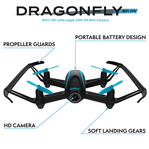 CAPTURE 120° WIDE-ANGLE PHOTOS/VIDEO WHILE YOU FLY. Take wing with drone Wi-Fi FPV capability that gives you a first-person view when using the Dragonfly drone Wi-Fi camera - specifically, a 720p HD camera perfectly suited to this drone's specs.