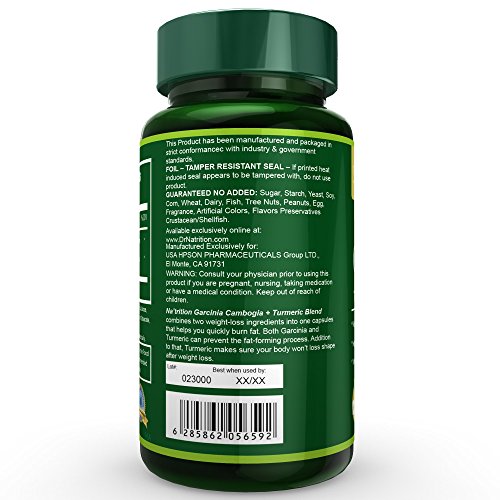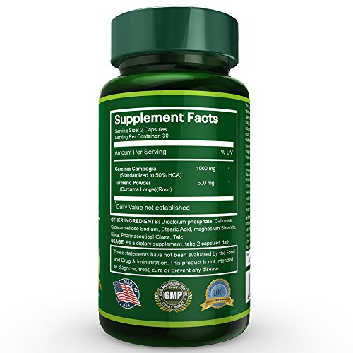-. Feature : WEIGHT MANAGEMENT FORMULA - Garcinia plus turmeric is the perfect combination of lowered fat absorption, increased metabolism and suppressed appetite. This special novel formula can help you lose weight while maintaining healthy weight level for long-term body care. / PURE INGREDIENT - We source our raw material from the most trustworthy company in the industry to bring the best quality products! / U.S. QUALITY - FDA-Inspected Facility - Unlike those who look for manufacture outside, we run this state-of-the-art manufacture ourselves and supervise EVERY detail in the process to make sure the product you purchase has the best possible quality! REMEMBER, our team of experts has more than 20 years of successful experience in cGMP process. We have successfully maintained FDA registration for more than 7 years without any problems; we will ALWAYS keep up with the quality in the future! / MONEY-BACK GUARANTEE - 2 Capsules per day for Maximum Strength and Potency - DON'T feel it effective? NO PROBLEM! We offer satisfaction money-back guarantee. If you can't feel the quality or you doubt the quality after purchase, just leave us an honest and unbiased comment, and we will refund you immediately! Your opinion will always help us to improve!