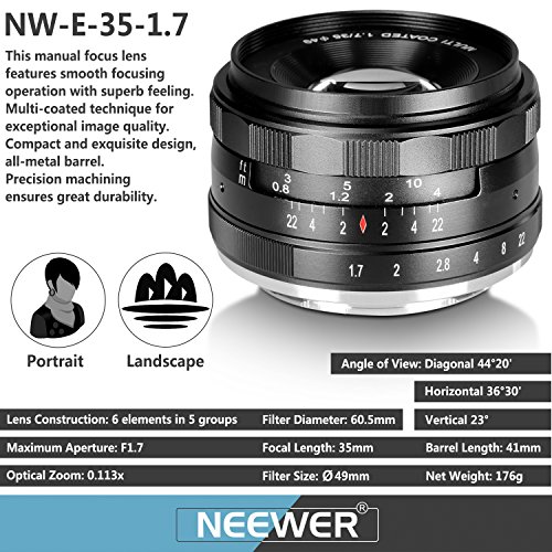 Neewer 35mm F/1.7 Prime Fixed Lens. Manual Focus, Maximum Aperture: F/1.7. Focal Length: 35mm