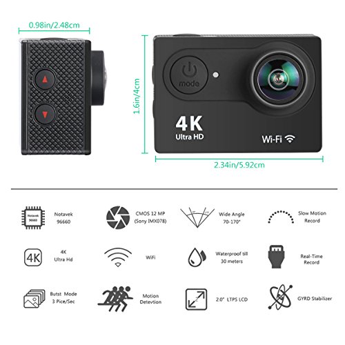 HiCool 4K Action Camera: Software hardware comprehensive upgrade, Designed follow Taiwan SunPlus scheme, High definition display and playback, 2 inch LCD panel, 4K@25fps/1080P@60fps video resolution provides premium footage. 12 MP image resolution with 170 degree wide angle lens which enables accurate motion capture and deliver sharp, professional video