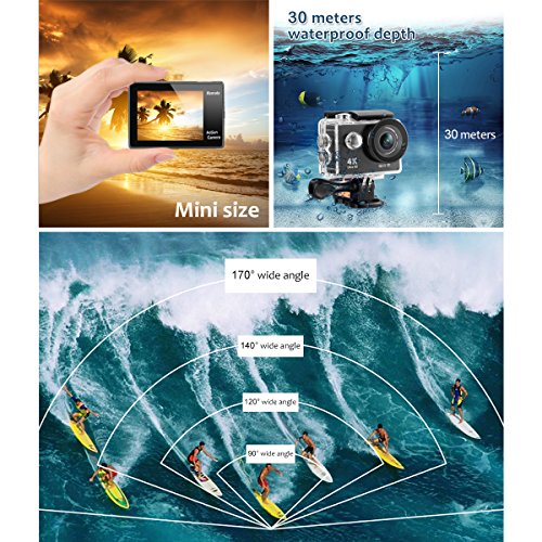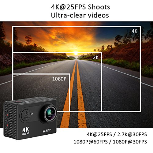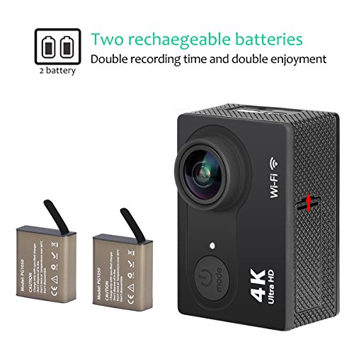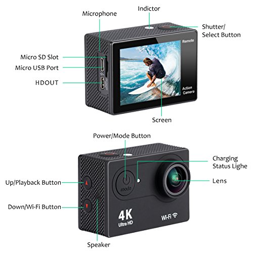Wireless Remote Control and Built-in WIFI: This 4K action camera features a 2.4 G wrist remote control. Up to 15M remote range, splash-proof, long-lasting battery life; Install“Ez iCam" according to specification and controlled by Android and IOS devices, the signal ranges up to 10 meters