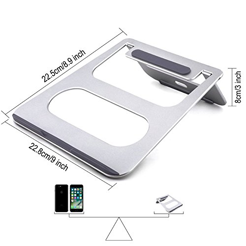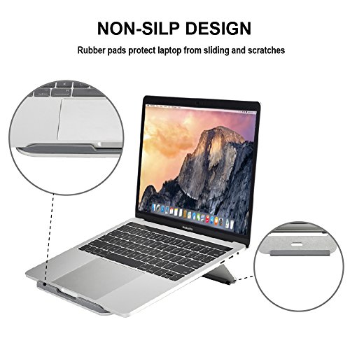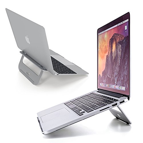 -. Feature : SLEEK, BEAUTIFUL DESIGN - Smooth, durable, premium aluminum steel matches all surfaces and devices (especially your macbooks). We've made this to bring your home and office desk setup to the next level! Compatible with Apple Macbook Pro, Macbook Air & other 10-15in laptops. iPad Pro, Surface Pro & other 9-15 inch tablets / ERGONOMIC - The tilted angle of the stand helps to prevent hand, wrist, neck, and eye strain and promotes proper posture while sitting. Minimize your chances of carpal tunnel when using your laptop for extended periods of time. This is a small investment for avoiding future stress and pain! / LIGHTWEIGHT, SOLID, COMPACT,PORTABLE and COOLING AIR FLOW-Easily slip this compact laptop stand in your bag and take from home, to office, to store, and back! Don't worry about it bending or breaking, because this laptop stand which is made of ultra-sturdy aluminum alloy is lightweight, yet provides solid stability.The aluminum material of this stand naturally dissipates heat to air faster than plastic or wooden laptop docks without the use of battery power or electricity. Now that's COOL! / STABLE & SECURE DOCK STAND - Have you tried other computer stands, or made a makeshift one that sent your laptop tipping or falling over? The non-slip padded platform and base of this stand adds EXTRA security for your laptop/ notebook- so you can use your device confidently! The elevated stand also keeps your laptop safe from any coffee or other spills on your desk. / ORGANIZE and OPTIMIZE - No more untangling cords. Use the cable slot to organize your cables and keep them from cluttering up your desk and distracting your workflow. Store small items under the stand to keep them out of sight, but within easy reach.