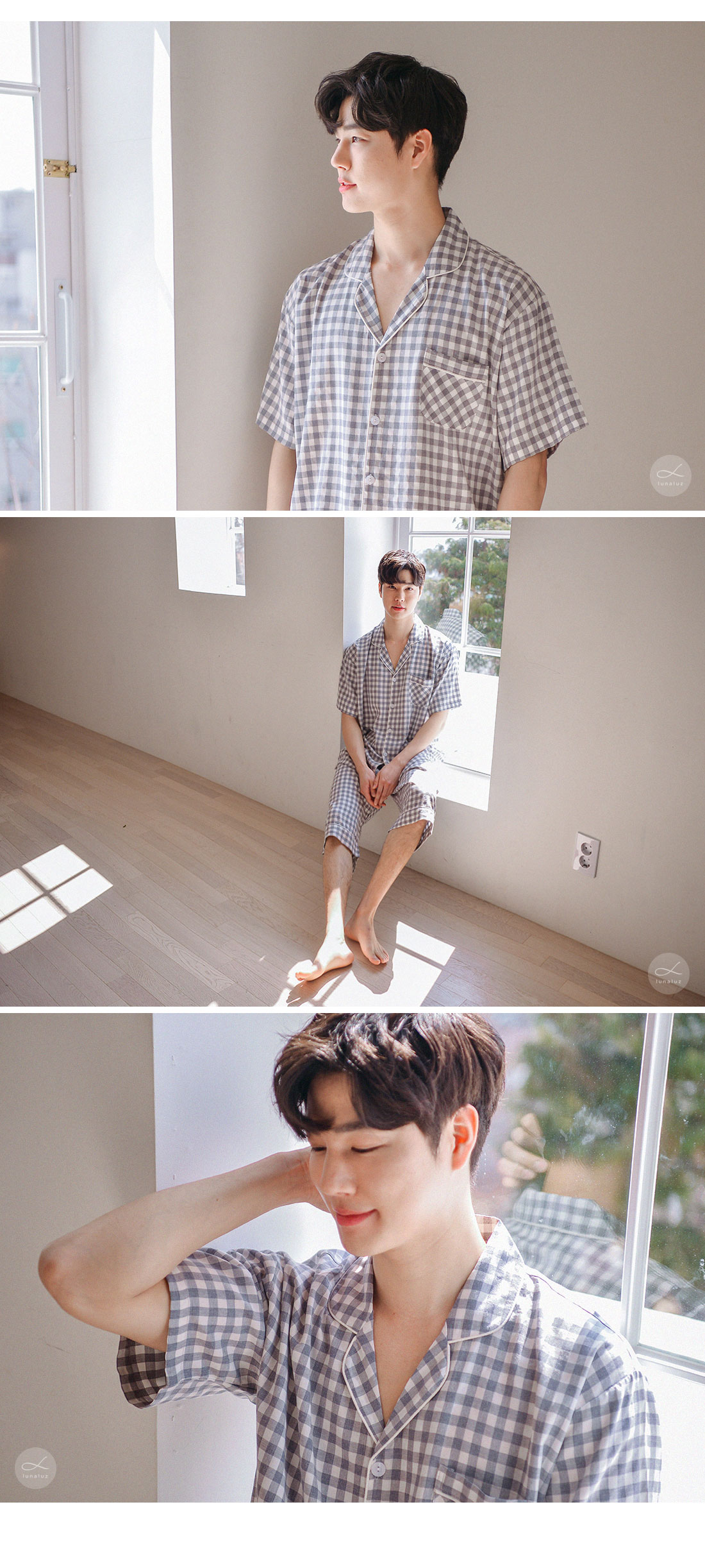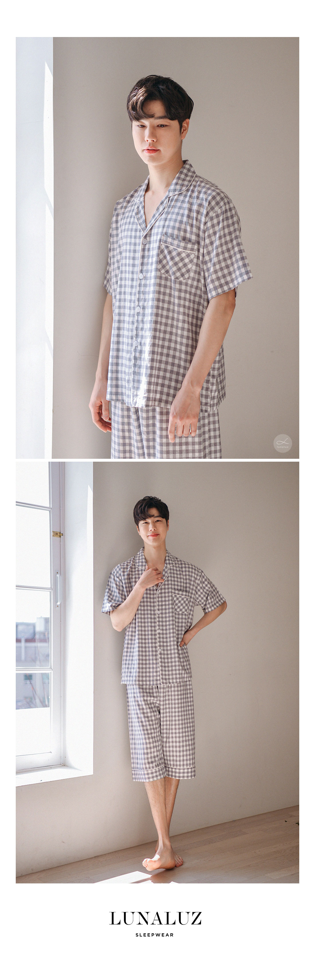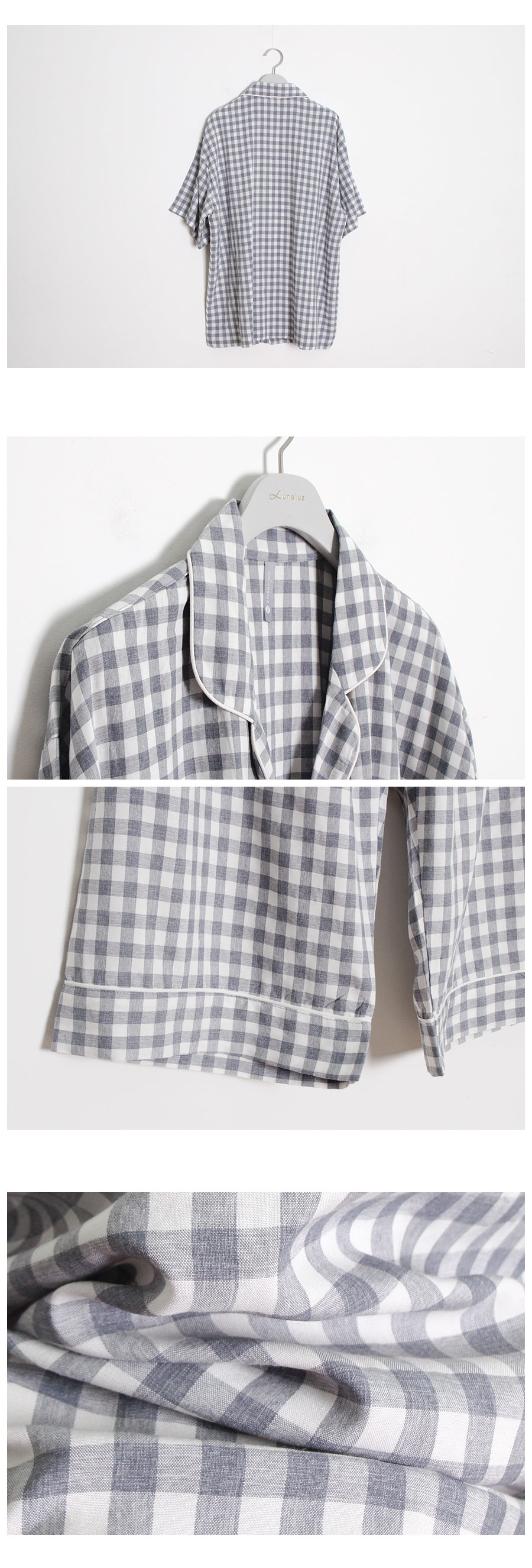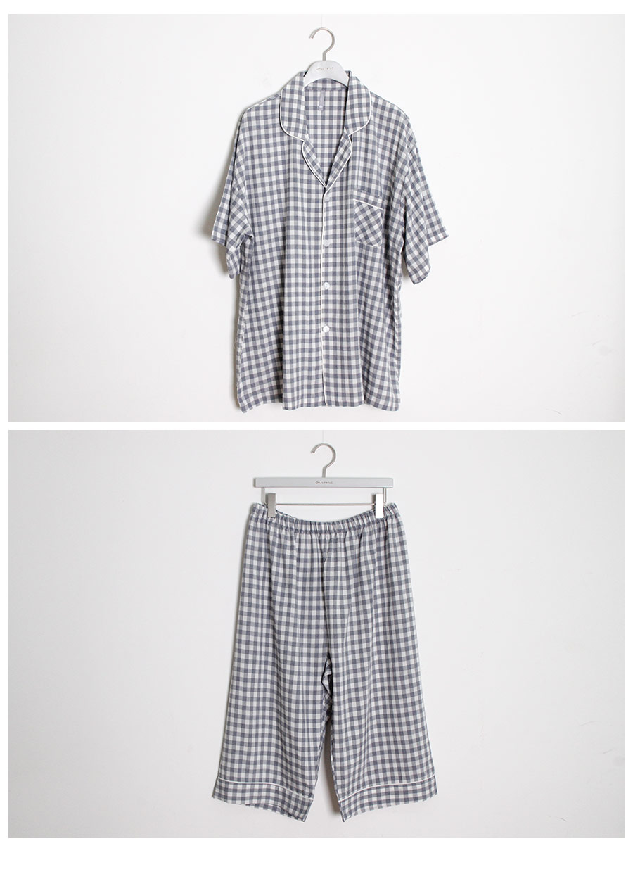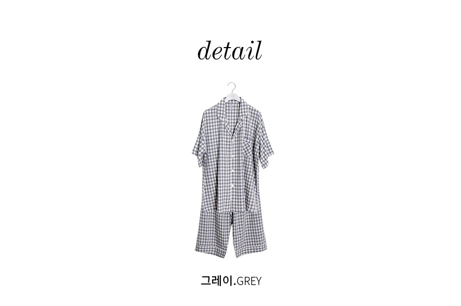 보기만 해도 편안해지는 그레이 체크 패턴의 파자마세트입니다. 직접 실을 염색시켜 짠 소재인 만큼 실루엣이나 소재 자체가 훨씬 고급스럽습니다. rayon52 nylon24 poly24 혼방으로 텍스쳐가 시원하고 흐늘거리며 고급스러운 분위기를 연출해줍니다. 탄탄하고 얇은 소재인 만큼 여름에 가볍게 착용하기 좋습니다. 단정하고 깔끔한 패턴으로 질리지 않고, 매 해 계속해서 손이 갈 스타일의 파자마세트입니다. 통기성이 우수해 상쾌하고 숙면을 취하기 좋은 쾌적한 느낌을 만들어 줍니다. 드레이프성을 가진 소재로 체형의 결점을 보완해주며 슬림한 효과를 준답니다. 여름에 입을 파자마세트로 적극 추천해드립니다. DETAIL 깔끔한 포켓 카라 파자마스타일로 군더더기 없는 단정한 느낌의 스타일입니다. 카라의 끝 부분에 아이보리 컬러의 파이핑을 클로징 버튼까지 꼼꼼하게 봉제해서 포인트를 주었습니다. 포켓은 원단 바이어스 처리해서 포인트를 주었습니다. 흐늘 거리는 부드러운 소재인 만큼 고난위도의 봉제기법이 들어간 세트입니다. 100%국내 제작으로 소재, 디자인, 봉제의 퀄리티가 높습니다. SIZE 평균 100size에게 적합한 free사이즈 입니다.
