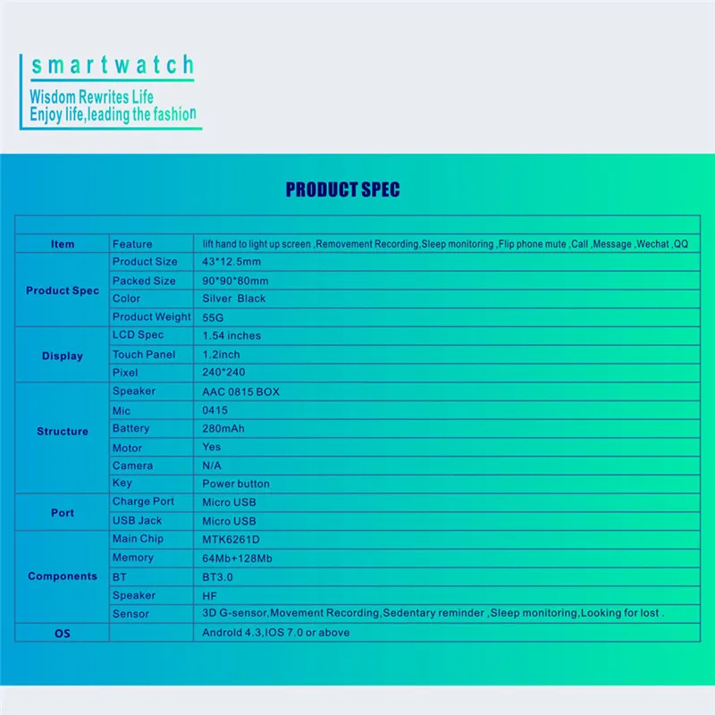 Feature:Message Reminder,Call Reminder,Bluetooth,Complete Calendar,Answer Call,Alarm