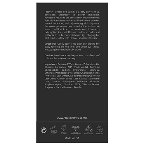 -. Feature : Forever Flawless Diamond Infused Eye Serum is a rich, silky formula developed specifically to deliver immediate, noticeable results to the delicate skin around the eyes. / Forever Flawless Eye Serum is formulated with extra-fine diamond powder, natural botanicals, and rejuvenating alpha hydroxy, this serum penetrates deep into fine lines to improve skin's condition from the inside out. / Forever Flawless Eye Serum corrects existing fine lines, wrinkles, and under-eye circles and puffiness, as well as prevents future signs of aging. / For best results, follow with Forever Flawless Eye Cream.