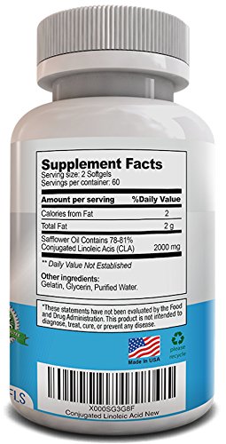 -. Feature : FAT LOSS - CLA has been clinically shown to aid in fat loss by increasing the body's metabolism.* / GAIN MUSCLE - Conjugated Linoleic Acid helps promote the growth of lean muscle mass and increases muscle retention.* / IMPROVE OVERALL HEALTH - CLA Safflower Oil Extract has been clinically shown to help support the immune system, cardiovascular health, bone health, healthy blood, cholesterol, proper insulin balance, food allergies, and reduce inflammation.* / USA MADE - Our plant derived CLA softgel dietary supplement is manufactured in the USA in an NSF/GMP certified facility, assuring you that your purchase meets strict standards for ingredient quality and safety. / 100% MONEY BACK GUARANTEE - When you order any of our products, you're protected by a 60 day, no-questions asked money back guarantee and world class customer support!