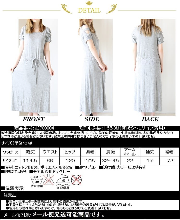 エレガントにもカジュアルにも☆ゆるシルエットなマキシ丈ノースリワンピ♪ 肩出しデザインでセクシーながら涼しい♪ ウエスト部分紐で調節可能なのもGOOD!! リピーターの方にも愛されてます♪当店人気ワンピースシリーズ新作入荷いたしました♪ お出かけにもリラックスタイムにも大活躍な万能アイテムです! 再入荷できないカラーもございますので、早いもの勝ちです。 Tシャツ生地に近い厚さで、落ち感、伸縮性のある生地です。 |