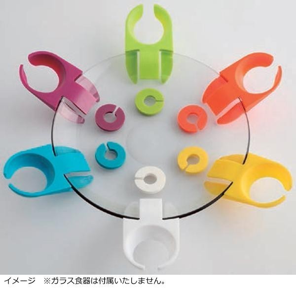 | グラスとプレートに目印を付けられるので、パーティー等の際に取り間違いを防ぐことができます。ビュッフェメイトをプレートの淵に挟んで、ワイングラスのステムを円部分に引っ掛けると、プレートとグラスを一緒に持つこともできます。 |