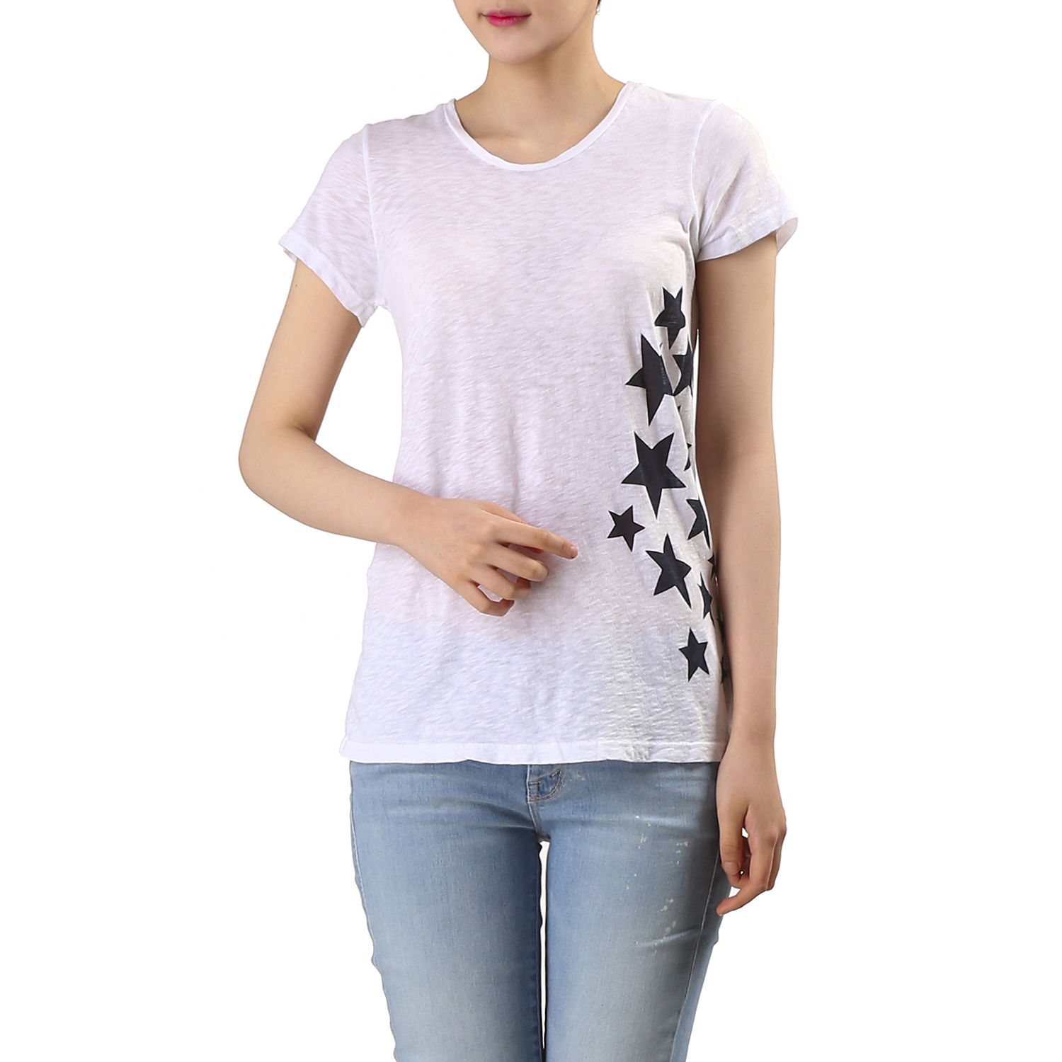 | 기본 화이트 반팔 티셔츠 입니다. 별 프린팅으로 포인트를 준 디자인으로 원단감이 얇아 한 여름까지 충분히 활용가능한 디자인 입니다. 간절기에도 셔츠나 이너웨어로도 좋은 아이템으로 유행없이 데일리룩에 코디하기 좋은 스타일 입니다. | |