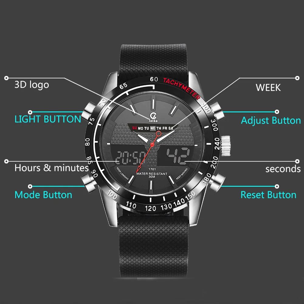 Feature:Water Resistant,LED display,Back Light,Week Display,Alarm