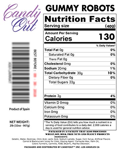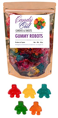 -. Binding : Misc. -. Brand : CandyOut -. EAN : 0635510675419 -. Feature : 2 Pounds Of Candyout Gummy Robots / Delivered in CandyOut Sealed Resealable Stand Up Bag With Ingredients and Expiration Date Label / Approximately 116 Pieces of Fresh Gummy Robots Candy in 2lb Bag / Product Of Spain - Packaged in USA by CandyOut / We Are The Only Distributor Of Our CandyOut Products So Make Sure To Buy Your Authentic CandyOut Gummy Letters From Us -. IsAdultProduct : 0 -. Label : CandyOut -. Manufacturer : CandyOut -. PackageQuantity : 1 -. ProductGroup : Grocery -. ProductTypeName : GROCERY -. Publisher : CandyOut -. Size : 32 Ounces -. Studio : CandyOut -. Title : CandyOut Robots Gummy Candy 2 Pound in Sealed Resealable Stand Up Bag -. UPC : 635510675419