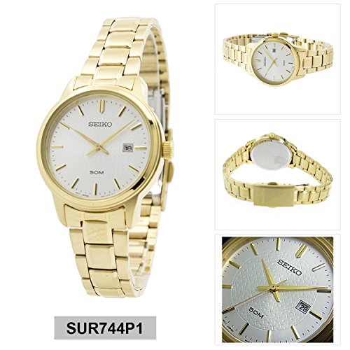 Gold-tone stainless steel case and bracelet. Fixed gold-tone bezel. Silver dial with gold-tone hands and index hour markers. Minute markers around the outer rim. Dial Type: Analog. Date display at the 3 o'clock position. Quartz movement. Scratch resistant Hardlex crystal. Pull / push crown. Solid case back. Case size: 30 mm. Case thickness: 7 mm. Round case shape. Band width: 12 mm. Push button clasp. Water resistant at 50 meters / 165 feet. Functions: date, hour, minute, second. Casual watch style. Seiko Neo Classic Silver Dial Ladies Watch SUR744P1.Feature