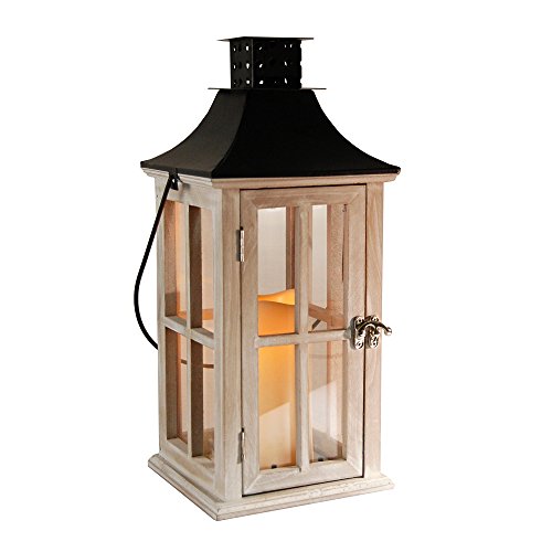 -. Feature : Included: wooden lantern with 4"battery operated led candle and wire handle / Timer: 5 hours on / 19 hours off / Flickering amber glow / Crystal clear plastic sides / Hinged door