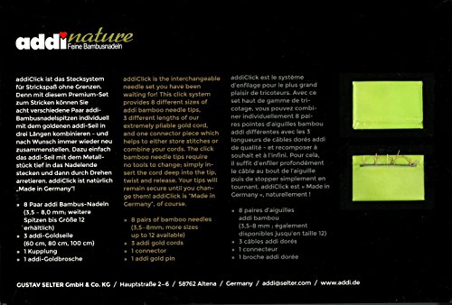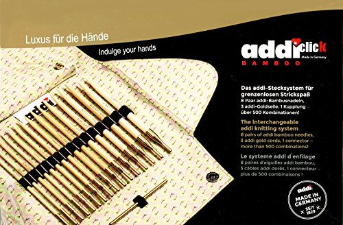 - Each addi Click Bamboo set includes 8 different sizes of addi Bamboo tips: US 4, 6, 7, 8, 9, 10, 10.75, 11; Metric 3.5, 4.0, 4.5, 5.0, 5.5, 6.0, 7.0, 8.0mm; includes exclusive and extremely pliable Gold cords which create needles sizes: US 24in., 32in., 40in.; Metric 60, 80, 100cm