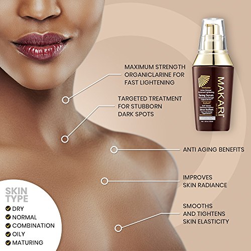 Luxury isn't limited to any one skin type. For years, women of color have sought high-end skincare products designed exclusively for their unique wants. Finally, with the Exclusive collection by Makari, everyone can achieve the bright, glowing complexion they've always dreamed of. Specially formulated for dry, mature skin, our powerful Exclusive Toning Serum is enriched with OrganiclarineTM, a naturally derived active whitening agent. To help accelerate fading and toning of especially dark spots, apply a small amount of serum up to two times a week. Watch as scars, pigmentation, and uneven patches fade away for a fresh, youthful, perfectly uniform appearance. This extra rich toner effectively targets stubborn spots on the arms, legs, and body and should be used routinely with Makari's complete line of Exclusive lightening products. Pair with our allover Toning Milk to achieve your ideal shade of beautiful!