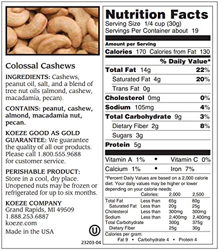 -. Feature : Koeze's Colossal Cashews are the world's biggest and most flavorful / Huge cashews roasted to perfection / Dressed up in our exclusive glass decanter and gold foil gift box / Kosher-KOAOA