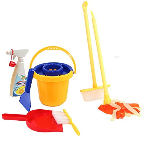 -. Feature : Adorable kids house cleaning set. / Set includes a pale, broom, mop, duster, dust pan and 'cleaning lotion'. / Cleaning tools measure in the range of 5 to 14 inches. / Comes in assorted bright colors. Pieces are durably made and sized for kids. / Manufactured by Dazzling Toys.