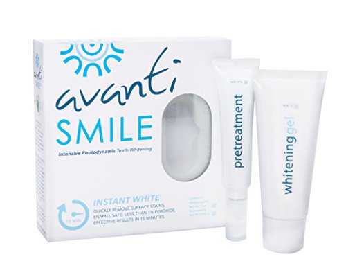 AvantiSmile delivers effective whitening results without tooth sensitivity or gum irritation. Receive outstanding light-accelerated whitening results without the additional hassle of bulky light devices, wires or batteries. Tested and approved by dental experts, this easy-to-use, photodynamic system provides visible results in 15 minutes. Instructions: 1) Charge the light-activated mouth tray by placing it under any type of light source (sunlight is best) for at least 5 minutes. 2) Brush your teeth with your usual toothpaste and tooth brush. 3) Apply pretreatment gel to the front (visible) surface of your teeth. 4) Fold the tray with the slightly larger side upwards. Apply a thin layer of whitening gel into the fluorescent tray, filling the inner front surface on both top and bottom with gel. 5) Place tray in your mouth by biting down gently. Close your lips to obtain a higher fluorescence in the dark. For best results, we recommend wearing the tray for 15 to 20 minutes.Feature