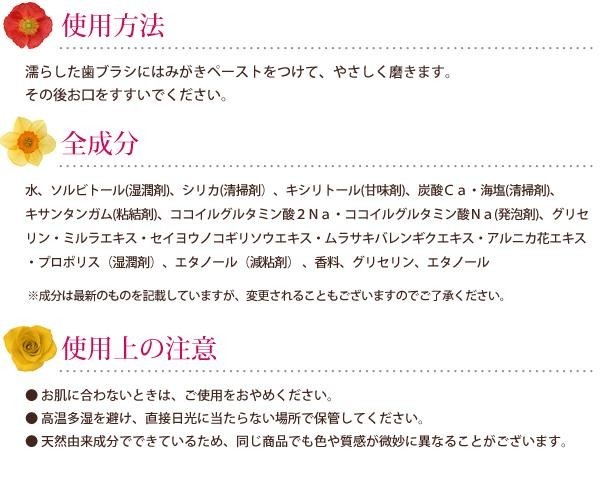 | うるおい成分海塩、エキナセア等を配合。歯垢を除去し、むし歯の予防に効果を発揮します。ハーブ調のさっぱりとした後味です。ご家族の毎日のオーラルケアにお使いいただけます。鉱物油や合成の保存料・着色料・香料は不使用! |