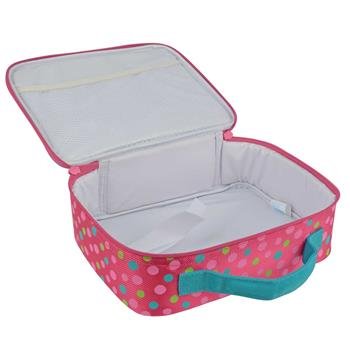 The lunch box is has a double zipper closure and is fully lined and insulated, making it perfect for hot or cold use. There is a velcro strap to hold a drink and a mesh pouch for extra storage. Measures approx. 10" x 7.5" x 3". Perfect kids in daycare, preschool or kindergarten.