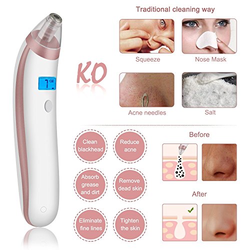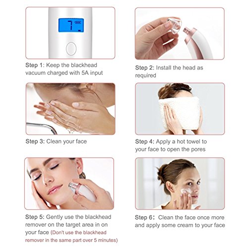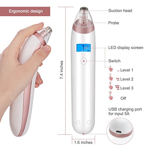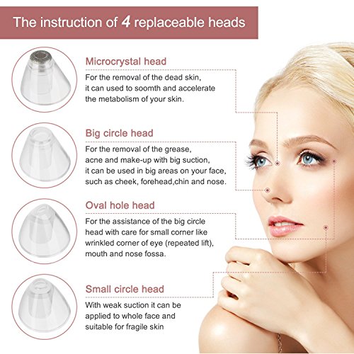 -. Feature : ♥ Impurities and dust particles in the pores,remove grease,blackhead, acne,exfoliate dead skin,treat sagging skin and wrinkle,shrink pores, Make your skin breathe freely and stay young. / ♥ Unique Design-- 3 level adjustable suction file and 4 replacement beauty head, which can meet your more demand and offer different functions and offer a deeper clean for your facial skin. / ♥ Easy to Use-- Clean your face,open pores,and use it to suck out blackheads,the remove blackhead machine built-in rechargeable battery,and it is USB charge, compact and portable for home and travel use. / ♥ Professinal Skin Purifying-- ABS material is environmental, safe, non-toxic and harmless to your skin,when you removing blackhead, a place to stay not more than 2 seconds, the whole process is not recommended for more than 5 minutes.Use the device 1-2 times a week with right ways. / ♥ Attention-- Please use the low level suction at the first use, and move it slowly. Don't let it stay in one place for too long to avoid leaving the red bruises. It's recommended to ice your face in case there are the red bruises. Use it regularly can improve your skin texture, brighten your skin color, boost the metabolism and regeneration.