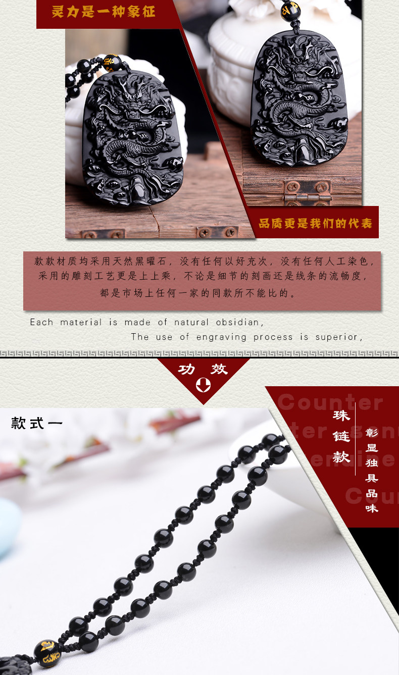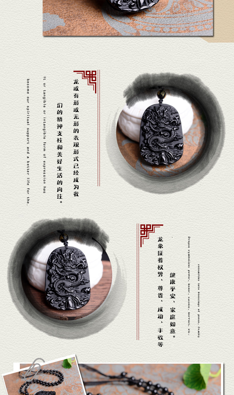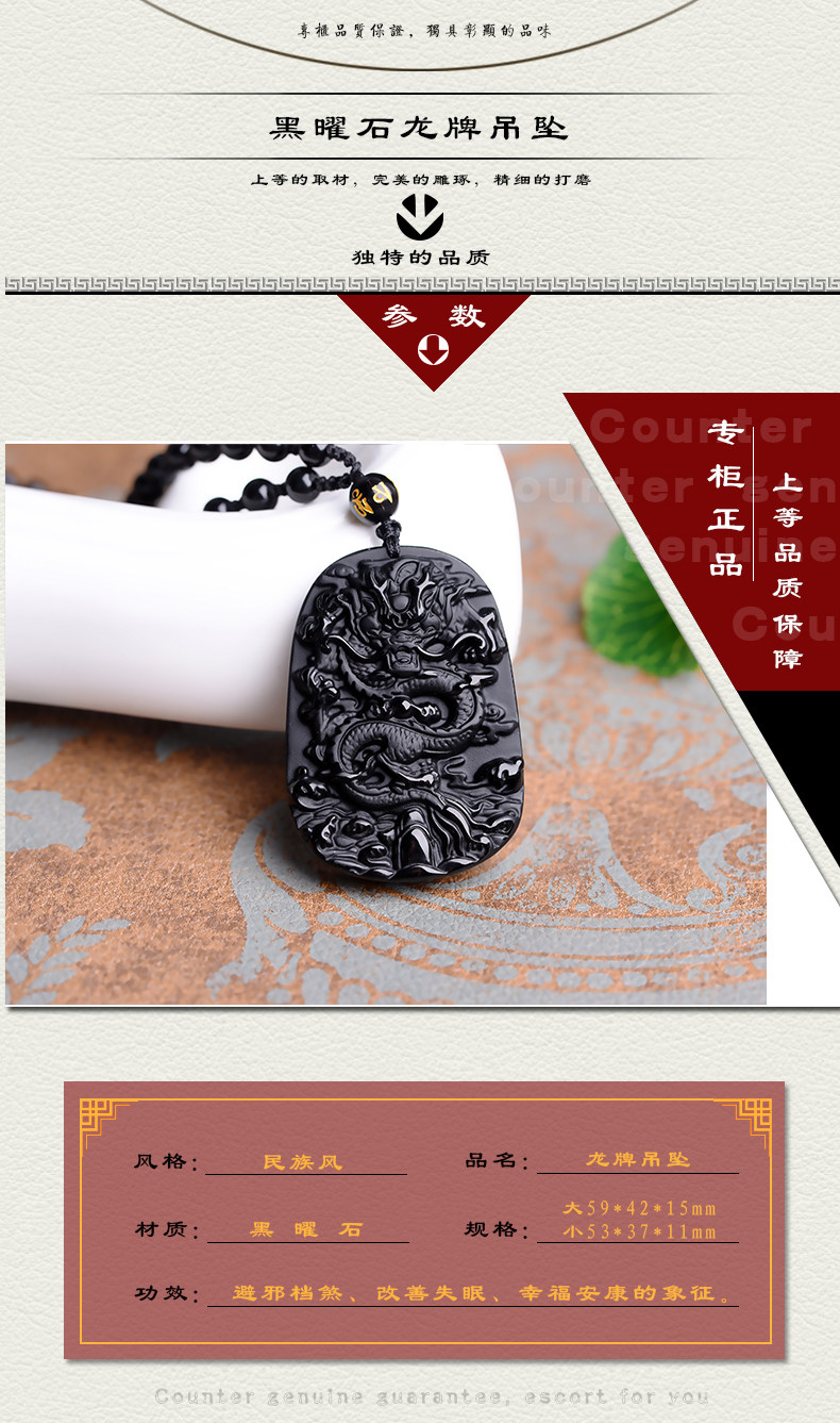 开光天然黑曜石龙牌吊坠龙腾四海辟邪转运男女款生肖项链挂坠