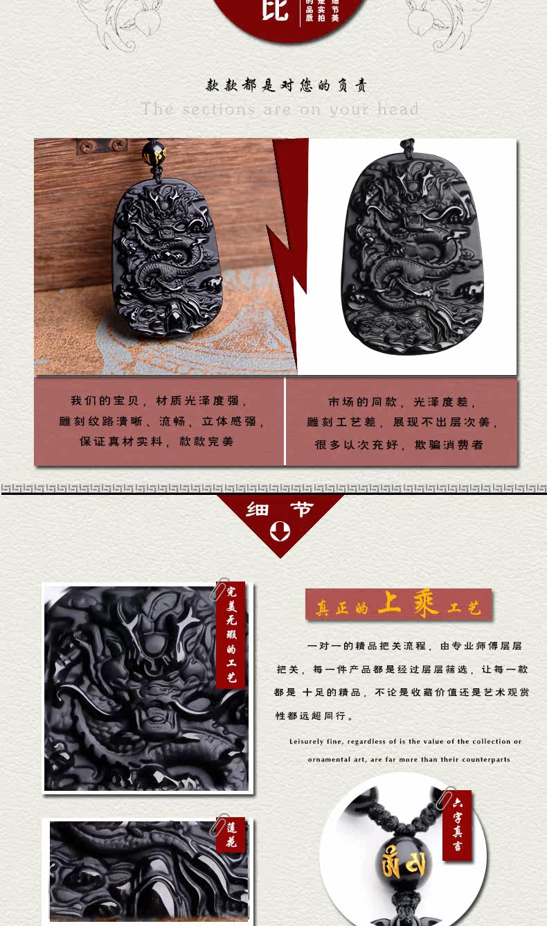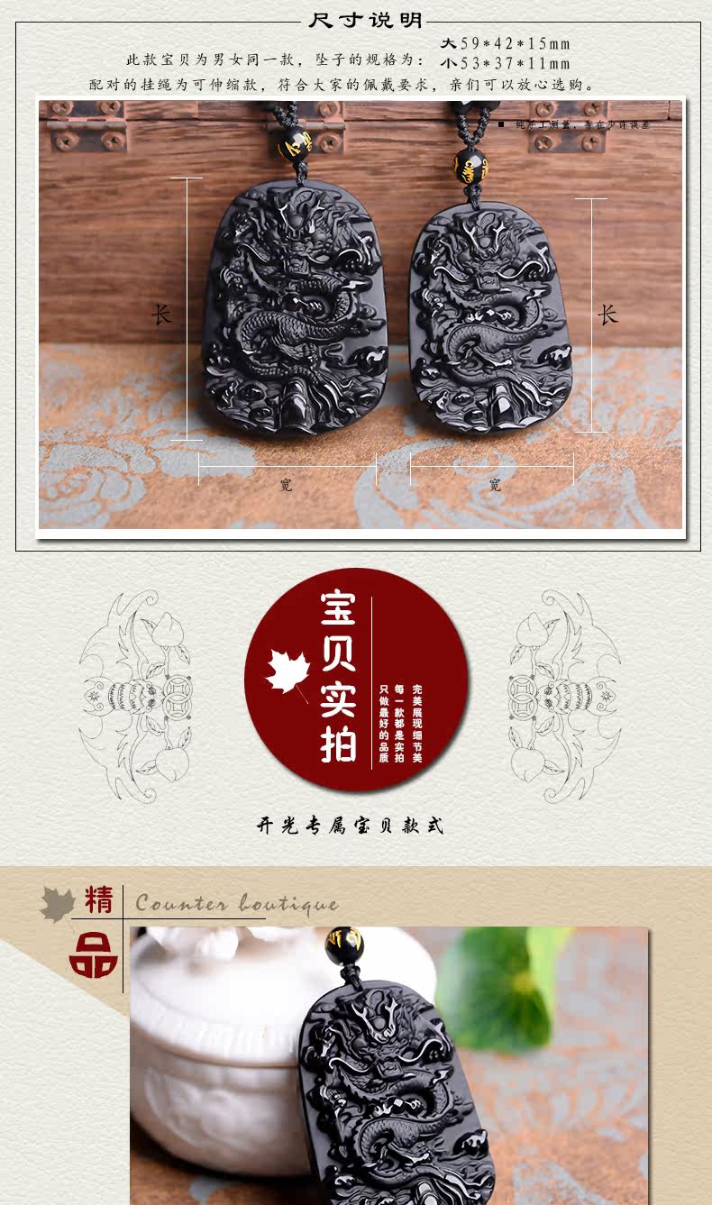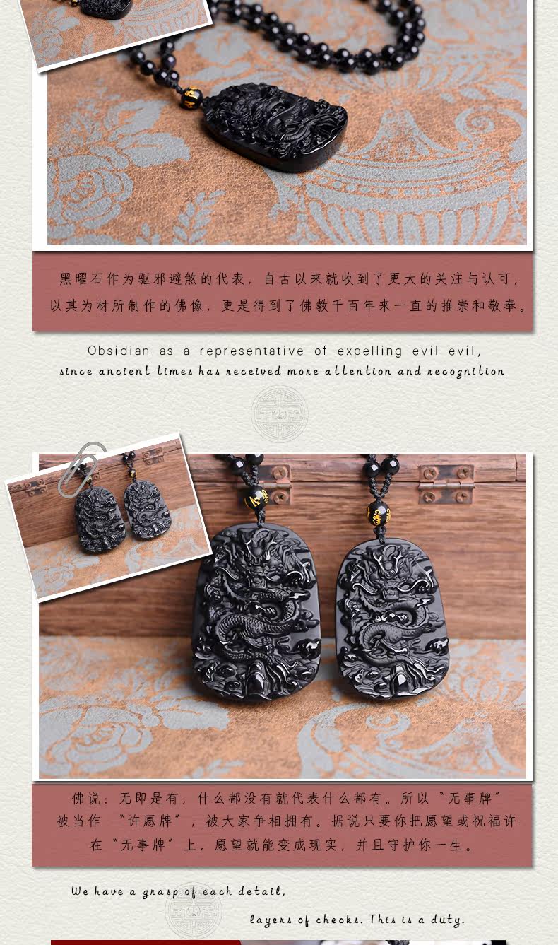 开光天然黑曜石龙牌吊坠龙腾四海辟邪转运男女款生肖项链挂坠