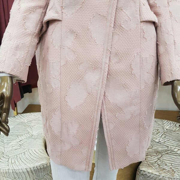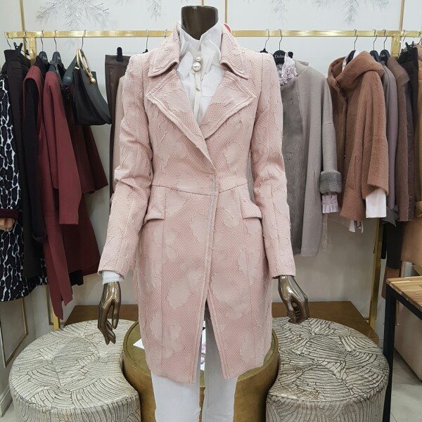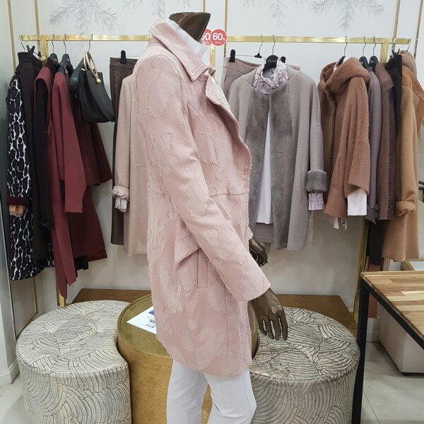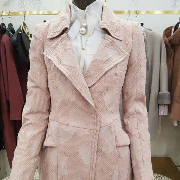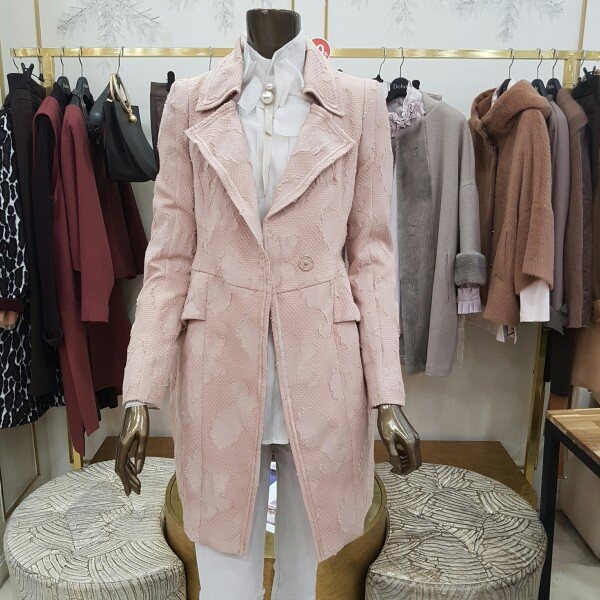 자카드 기법이 사용된 테일러드 자켓으로 실제 색상은 핑크빛이 살짝 도는 베이지 색상이니 참고해주시길 바랍니다(도호의 기본 하프자켓입니다)