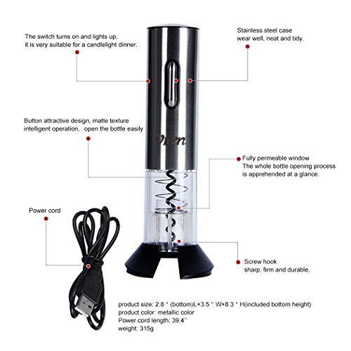 •Material: high grade stainless steel, long service life, it can start work after a full charge with USB cable, avoid the danger caused by using manual corkscrew