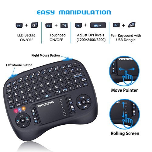 This 2.4Ghz wireless 5-in-1 versatile mini keyboard is characterized by mini-sized & portable, ergonomic design, powerful hot keys, 3-level adjustable speed touchpad and stable wireless transmission, perfect for office, game, entertainment and etc.