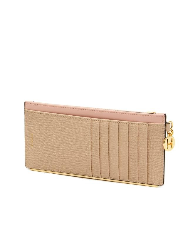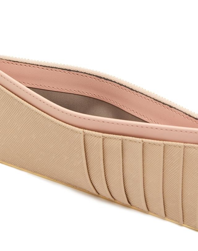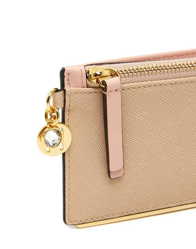 사피아노 가죽에 브랜드 로고 큐빅 참장식과 골드바로 포인트를 준 카드장지갑 입니다.