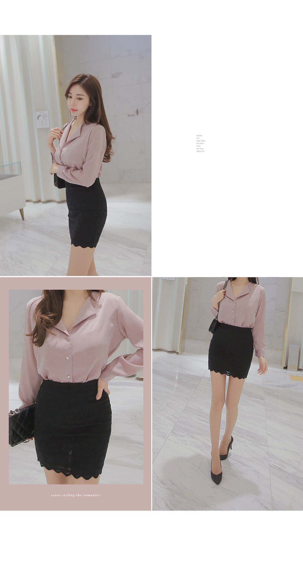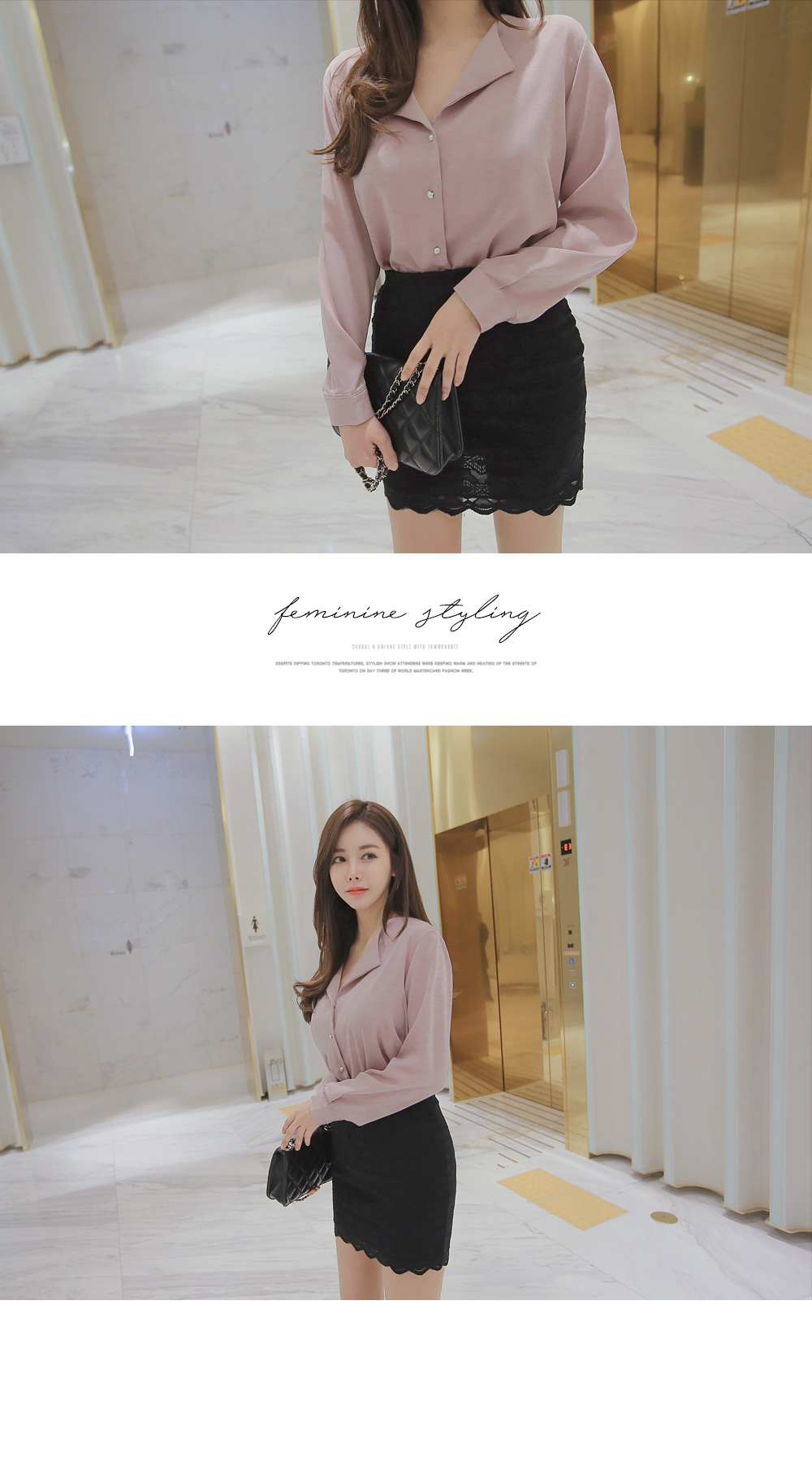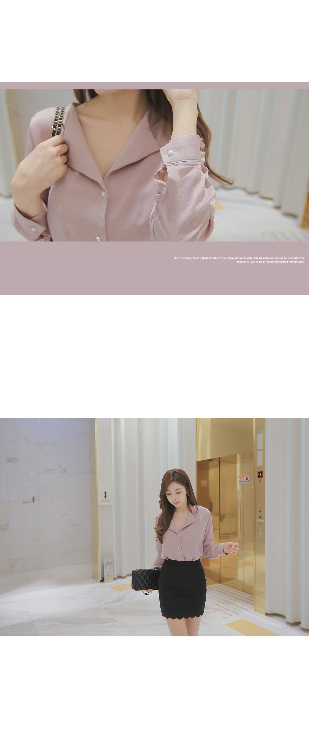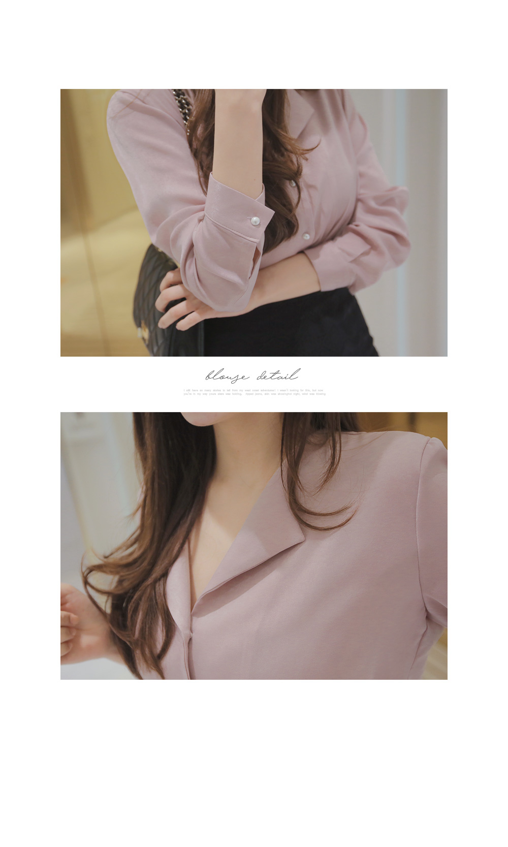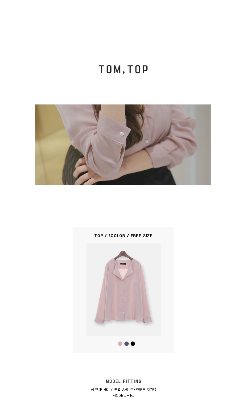 페미닌한 무드의 실크 느낌 블라우스 아이템 소개 할게요.폴리 소재로 제작이 된 상품인데요,실키한 느낌으로 고급스러운 무드는 물론이며브이넥으로 떨어지는 넥라인에 양쪽 카라로 디테일이 더해져여성스러움이 물씬 풍기는 아이예요.프론트부분에 쪼르르 진주 단추가 더해져포인트를 이루어 주는 동시에 로맨틱한 감성까지 선사해 드리구요~팬츠, 스커트 등 다양하게 잘 어울려 준 아이랍니다!데이트룩, 하객룩 등 격식있는 자리에 입어도굉장히 잘 어울려줘 추천해 드려요.밝은 컬러는 비침이 있을수 있으니 이너를 착용해주세요.핑크,아이보리,네이비,블랙 4가지 컬러로 만나보세요 :)