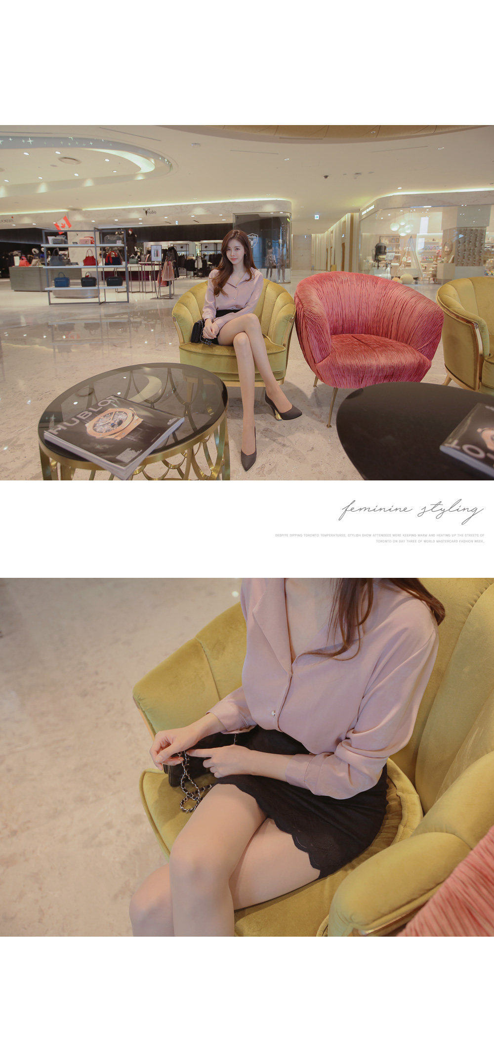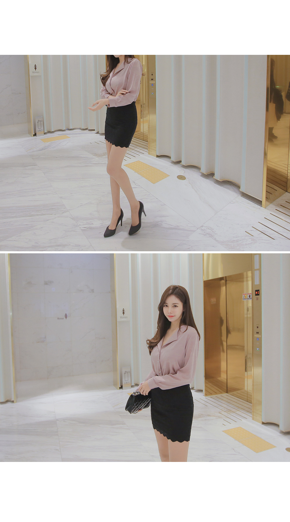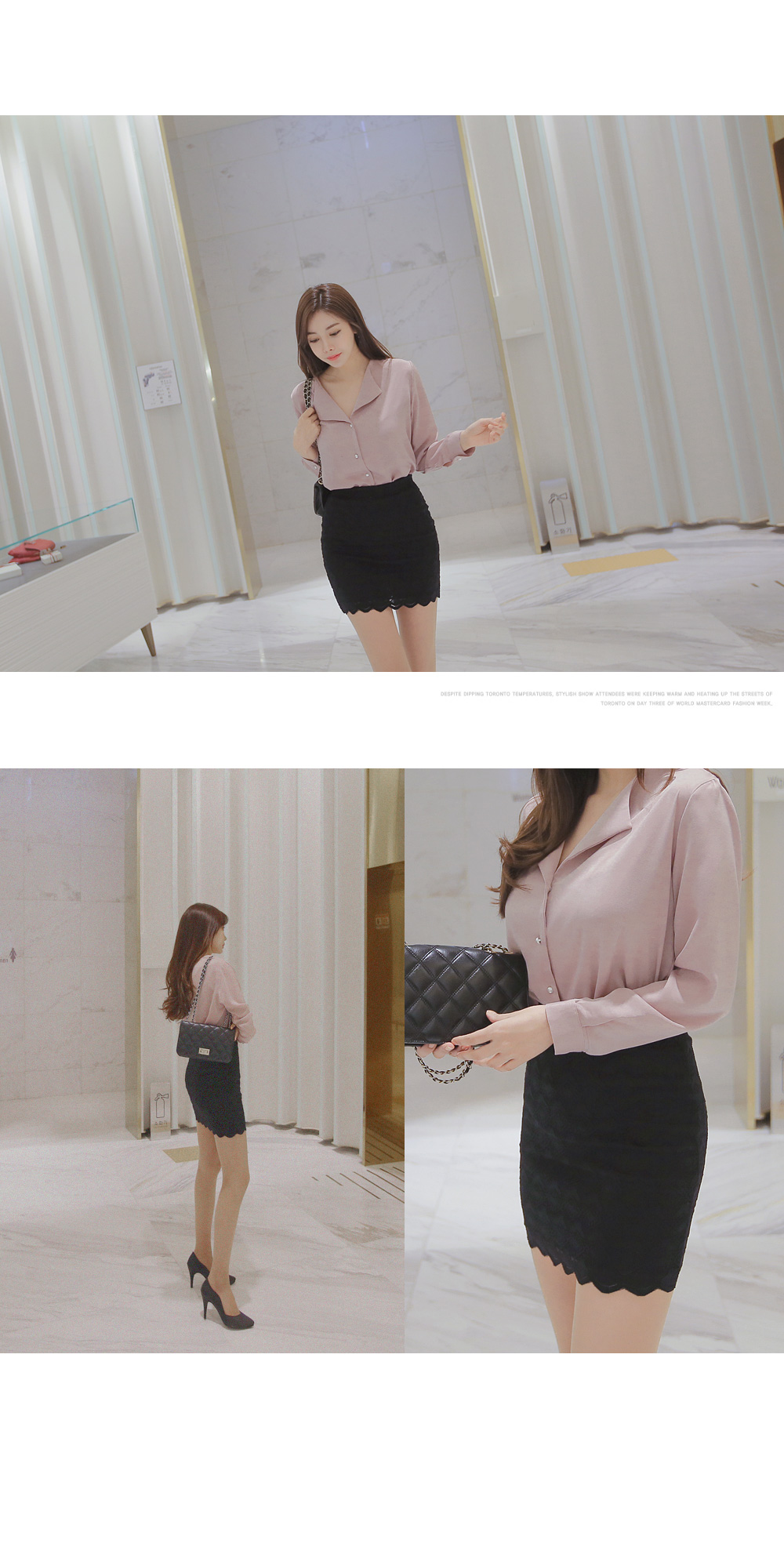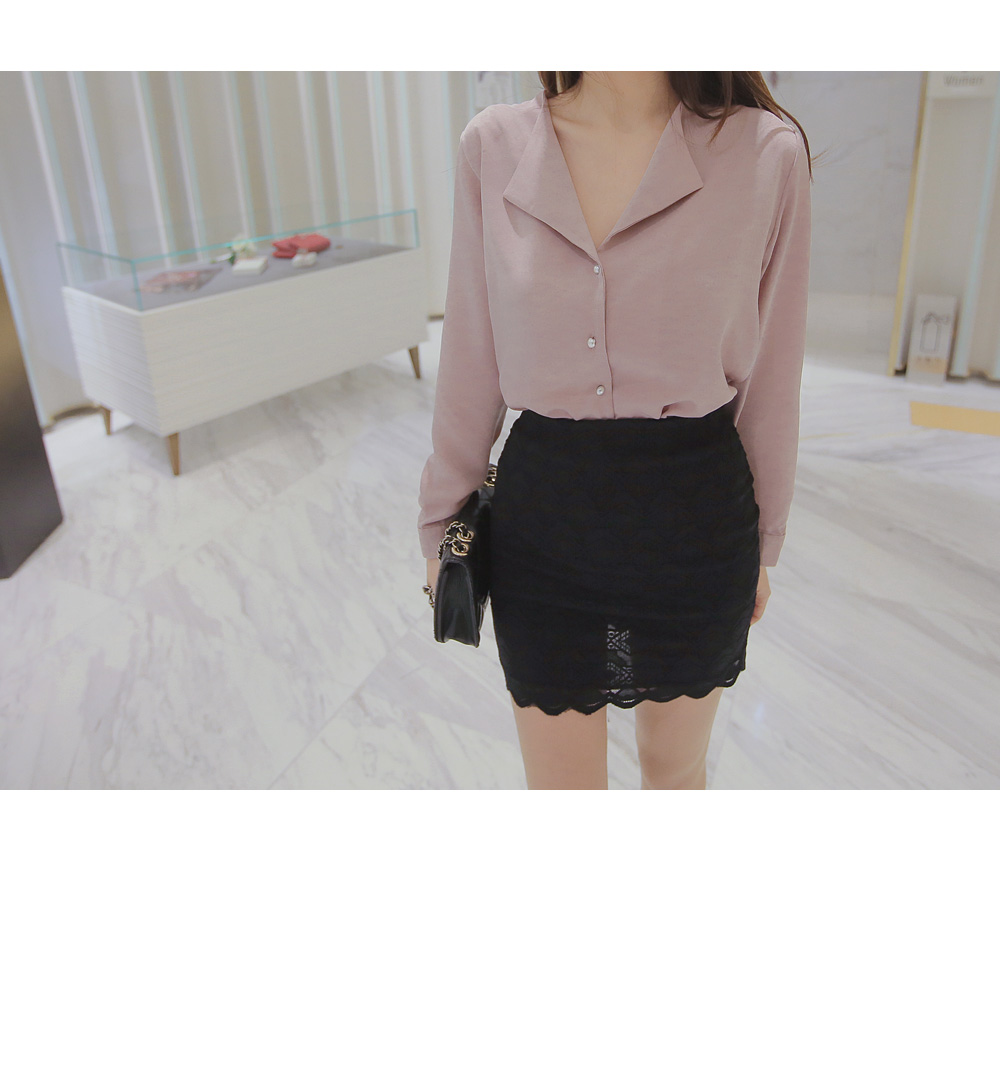 페미닌한 무드의 실크 느낌 블라우스 아이템 소개 할게요.폴리 소재로 제작이 된 상품인데요,실키한 느낌으로 고급스러운 무드는 물론이며브이넥으로 떨어지는 넥라인에 양쪽 카라로 디테일이 더해져여성스러움이 물씬 풍기는 아이예요.프론트부분에 쪼르르 진주 단추가 더해져포인트를 이루어 주는 동시에 로맨틱한 감성까지 선사해 드리구요~팬츠, 스커트 등 다양하게 잘 어울려 준 아이랍니다!데이트룩, 하객룩 등 격식있는 자리에 입어도굉장히 잘 어울려줘 추천해 드려요.밝은 컬러는 비침이 있을수 있으니 이너를 착용해주세요.핑크,아이보리,네이비,블랙 4가지 컬러로 만나보세요 :)