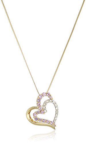 -. Title : 10k Yellow Gold Necklace with Pink Sapphire and Diamond Heart Pendant, 18"