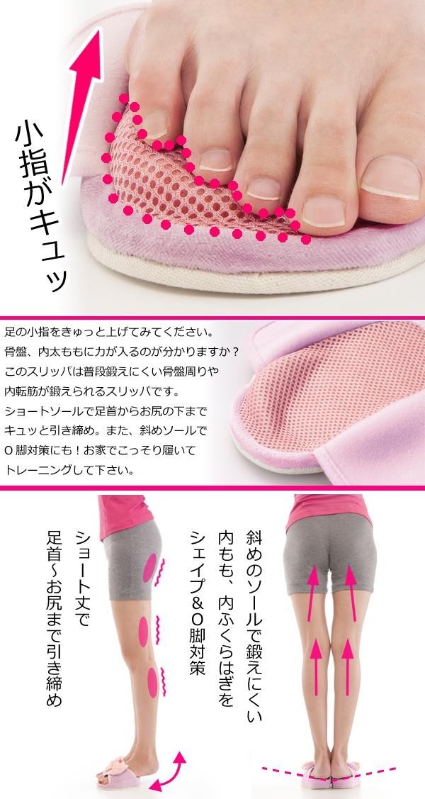 | 足の小指を上げると骨盤、内太ももに力が入る原理を応用し、履くだけで普段鍛えにくい骨盤まわりや内転筋が鍛えられるスリッパです。ショートソールで足首からお尻まで引き締め、斜めソールでO脚対策にも効果的です。 |