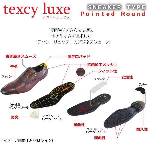 | 従来のtexcy luxe(テクシーリュクス)の機能性はそのままに適度に角ばったつま先のスタイリッシュなデザイン。スマートに見える見た目から想像できないほど足入れはゆったり。 |