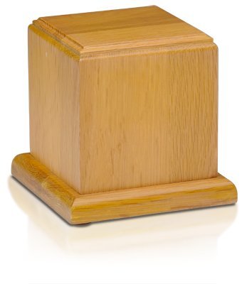 - Solid wood cube urn made of birch wood with beautiful Oak finish with clear laquer coat. Base securely closes with screws.