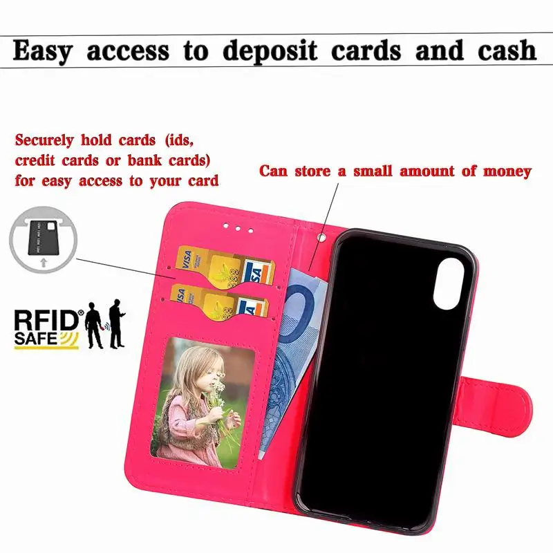 Features:Book Flip Style + Ultra Slim+Card Slots + Photo Slots + Cash Slot