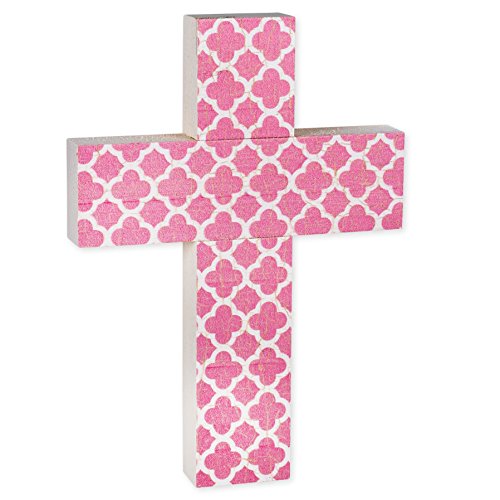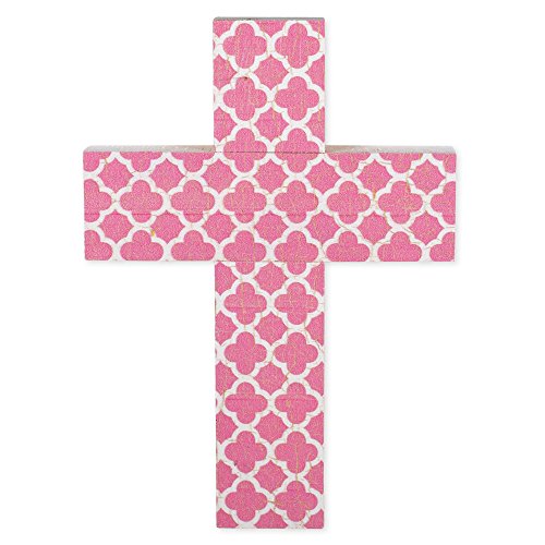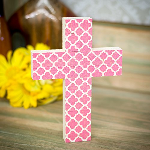 Pink and White Quatrefoil Distressed 7 x 5 Wood Wall Art Cross Plaque