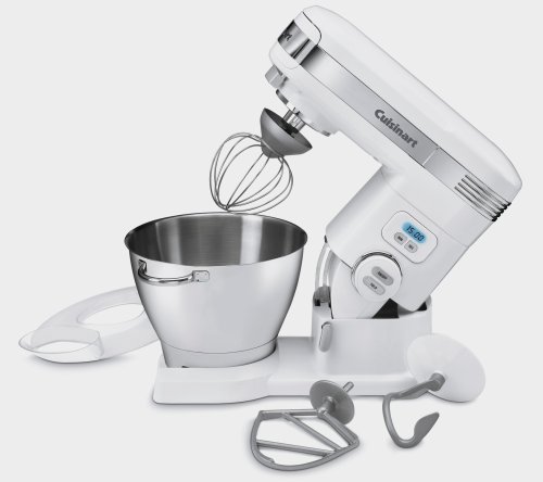 This stand mixer features a powerful 800-watt motor that can handle the heaviest mixing tasks. Its large, 5-1/2-quart, stainless-steel bowl accommodates big batches--even double recipes. The unit also provides 12 mixing speeds, along with a 15-minute countdown timer and automatic shutoff, for maximum precision. Choose the slow-start function to eliminate splatter or the ultra-gentle fold function to carefully blend in delicate ingredients. The mixer's tilt-back head allows for easy access to the mixing bowl and makes attaching accessories simple. Accessories include a chef's whisk, a flat mixing paddle and a dough hook, as well as a splashguard. The whisk aerates ingredients to increase volume or can also be used on slow speed to gently combine dry ingredients. Contoured to reach the bottom and sides of the bowl, the flat mixing paddle ensures thorough mixing. The dough hook makes hand kneading obsolete, while the splashguard offers an extra-wide pouring spout for easily adding ingredients. The stand mixer also contains three power outlets, including a high-speed outlet for its optional dedicated attachments (meat grinder, citrus juicer, blender, food processor, or pasta maker--all sold separately). The stand mixer measures 15-1/2 by 10 by 12-1/2 Inch and carries a three-year product warranty and a five-year motor warranty. From the Manufacturer More than 30 years ago Cuisinart changed the way the world cooked. Now it's changing the way the world mixes with the Cuisinart stand mixer. The new extra-large Cuisinart 5-quart mixer has the power, capacity and precision to handle any job a recipe requires and delivers more power to mix even the heaviest dough. Theres also more capacity to double and triple recipes. The mixer comes with three accessories, allowing you to mix, whip, or even knead dough. It has 12 speeds to ensure splatter-free starts and fabulous finishes. In addition, Cuisinart offers optional attachments that can be purchased separately. Each attachment connects to one of the three power outlets on the mixer (two on the top and one on the front) to let you blend, process food, squeeze juice from your favorite citrus fruits, make homemade pasta, or grind your own meats. Multiple Outlets Mean More Functionality High-speed power outlet for the blender and food processor attachment (sold separately), which connects to the rear power outlet on top of the stand mixer. Mid-speed power outlet for the citrus juicer attachment (sold separately), which connects to the front power outlet on the top of the stand mixer. Slow-speed power outlet for the large meat grinder and the pasta-maker attachments (sold separately), which connect to the power outlet behind the slow-speed outlet cover on the front of the stand mixer head. An Array of Helpful Features The mixer's tilt-back head securely locks the stand mixer into a raised position, which allows easy access to the 5-quart mixing bowl and makes it easy to attach accessories. The stainless-steel bowl includes handles, which makes the bowl easy to hold, scrape and remove and it's oversized to let you mix larger quantities. The mixer has a handy 15-minute countdown timer, plus a slow-start function that eliminates splatter for the most delicate ingredients. The fold function allows you to mix in ingredients at the lowest speed with two options--continuous, to blend ingredients and pulse, to combine ingredients. Each pulse generates 1-1/2 to 2-1/2 revolutions of the flat mixing paddle, chef's whisk, or dough hook. The flat mixing paddle, dough hook, or chef's whisk spins independently while rotating around the mixing bowl for the quickest, most thorough results. No need to rotate the mixing bowl--Cuisinarts stand mixer does all the work for you. Features: Large 5-quart-capacity polished stainless-steel bowl Powerful 800-watt motor 15-minute countdown timer Auto shutoff and 12 speeds Includes 3 accessories: chef's whisk, flat mixing paddle, dough hook Splashguard with pour spout to prevent spattering Recipe book Power unit: clean with a damp cloth and dry Bowls and tools dishwasher-safe (tools top-rack dishwasher-safe) Warranty: Limited 3-year product warranty and a full 5-year motor warranty .Feature