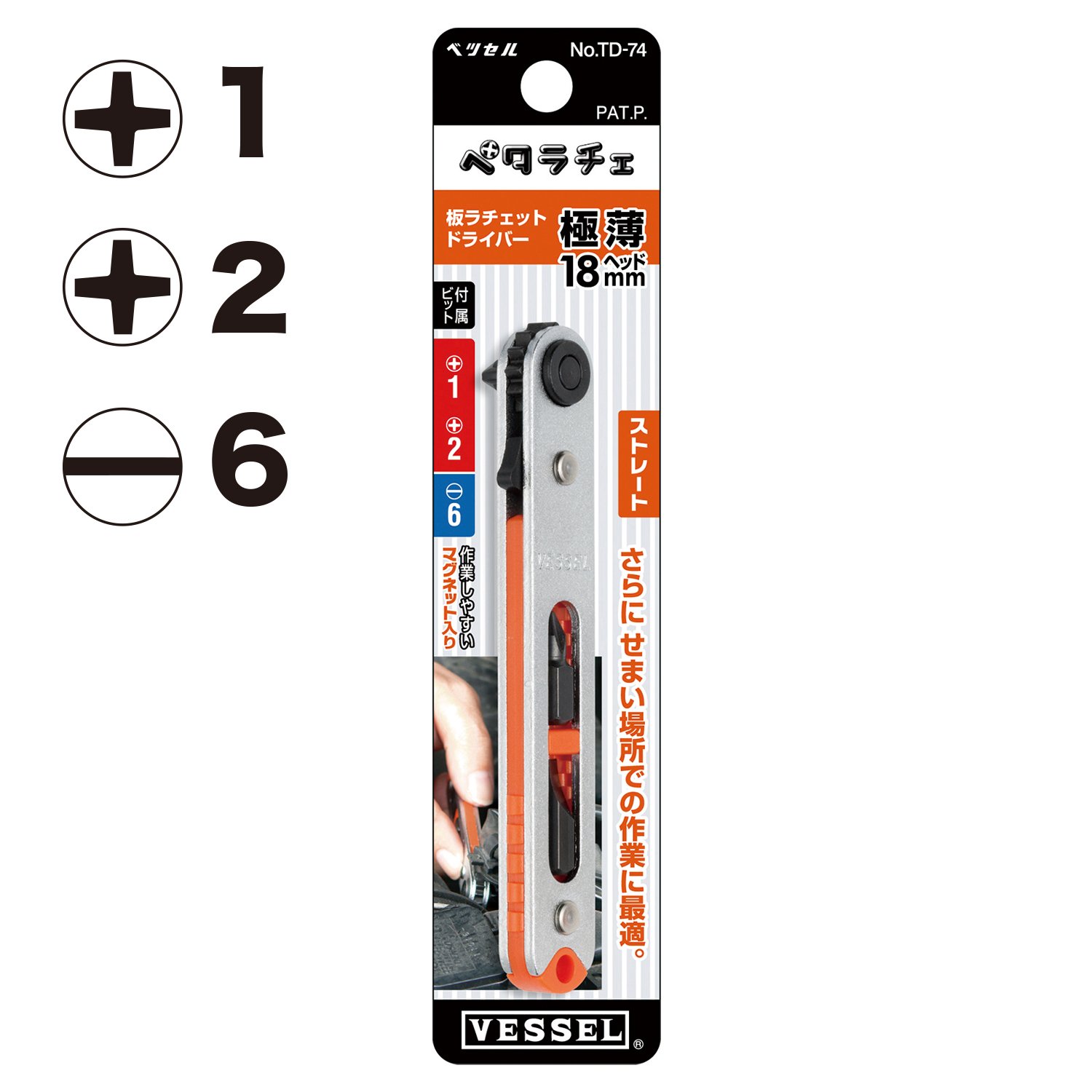 ● Blade tip: [[(+)]] 1 · 2, [[(-)]] 6 ● Total length (mm): 105 ● Weight (g): 62 ● High precision ratchet gear, secure tightening possible.