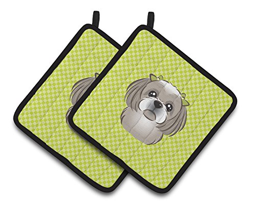 Caroline's Treasures Checkerboard Lime green Gray Silver Shih Tzu Pair of Pot Holders BB1312PTHD, 7.5HX7.5W, Multicolor
