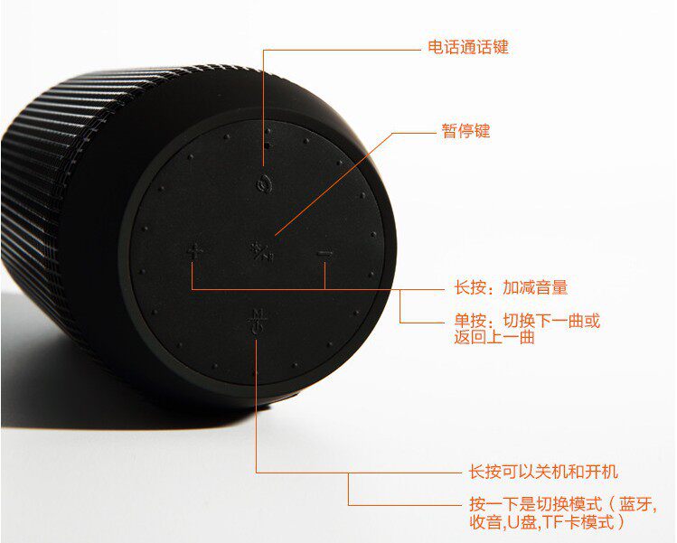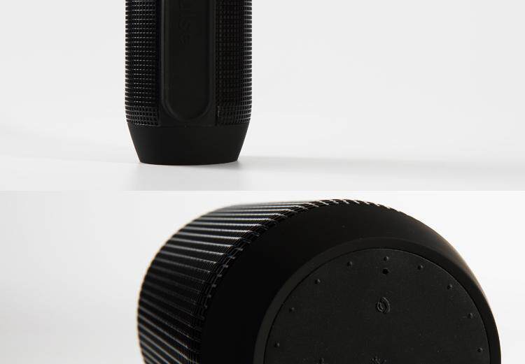 音响的顶面和底部均采用了橡胶材质包裹,显得非常具有户外性。其顶部为整体的操控区域,上面拥有电话接听、开关机以及灯光调节和上下区五个按键,当开机后充电插口的灯光会亮起,打开手机蓝牙就可以连接了哦。