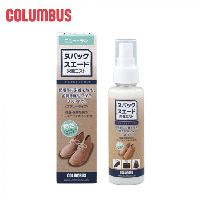 起毛革(ヌバック、スエード、ベロア、ムートン等)の靴、バッグ、ウェア等に!!無色なので、どんな色の起毛革にも使えます。 製造国:日本 成分:エタノール、シリコーン、精製水、ローズヒップオイル 内容量:100ml ※サプライヤー直送品 ご注文後3~4営業日後の出荷となります【商品名】コロンブス シューケア ヌバック・スエード栄養ミスト ニュートラル (レザーキュア) 100ml