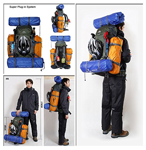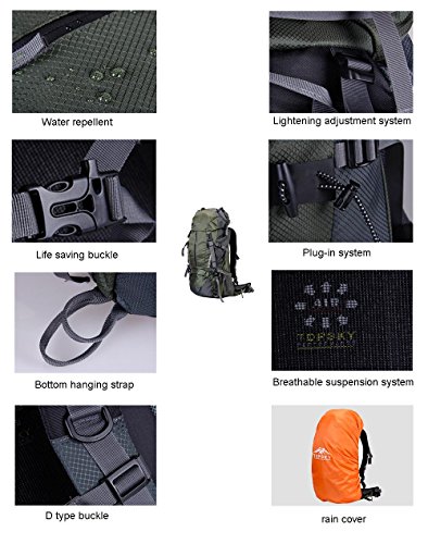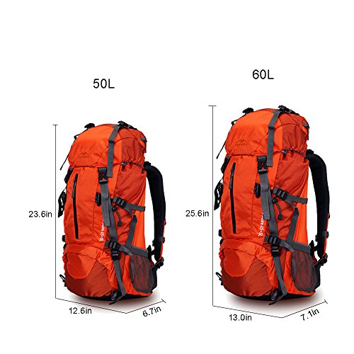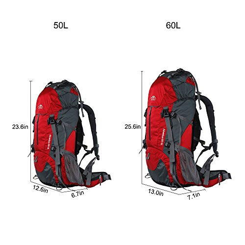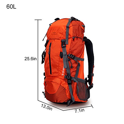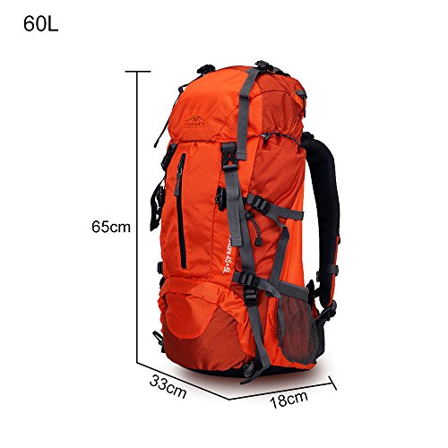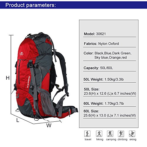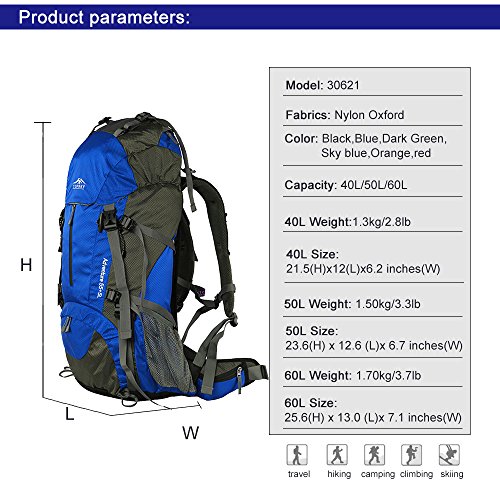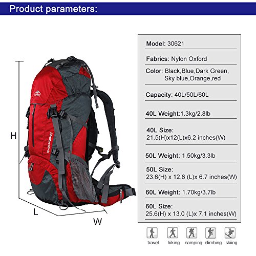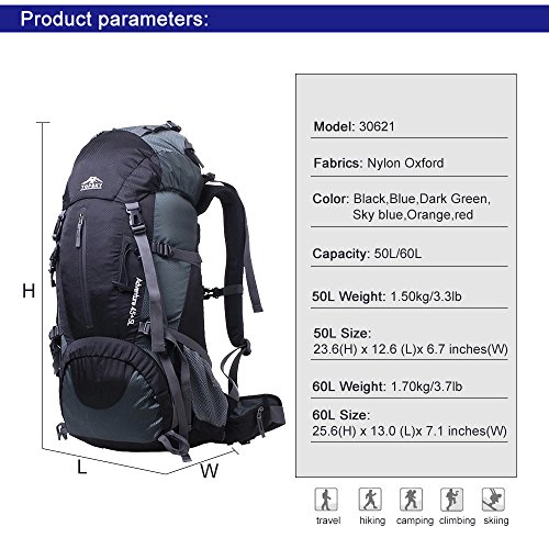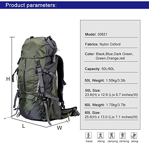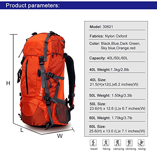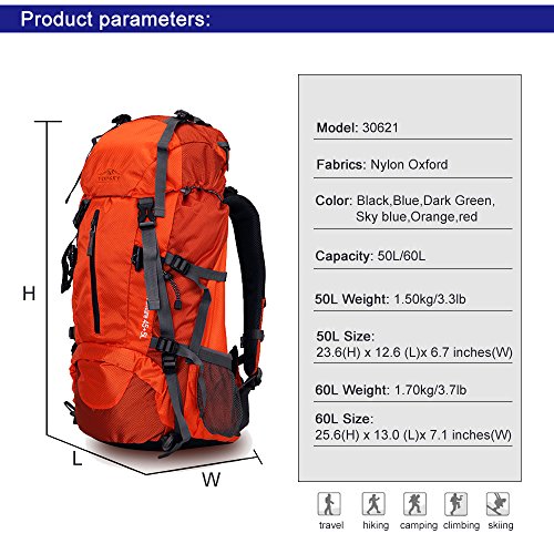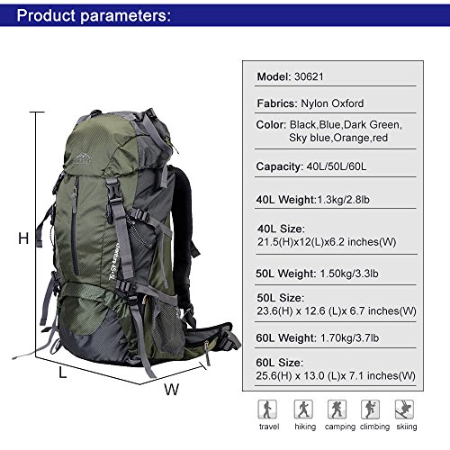 Topsky Product Instructions: Name: T30621 50l 60l internal frame backpack Material:High quality nylon and oxford fabric Colors: Black,Blue,Red,Orange,Green,Dark Green Capacity:50L, 1.5kg, Size(HxLxW):23.6*12.6*6.8 inches/60*32*17 cm. Capacity:60L, 1.7kg, Size(HxLxW):25.6*13.0*7.1 inches/65*33*18 cm. Features 1. High quality nylon and oxford fabric, water repellent, tear resistant, wear resistant, breathable and moistureproof, smooth and comfortable. 2. Main compartment, secondary compartment, sleeping bag compartment with divider, bladder compartment with hydration access, hip-belt pocket, top lid pockets, side zipped pouch and mesh side pockets to keep your stuff separate and organized. 3. Use the removable TCS resin mesh carrying system, breathable widened and thickened S type strap, air cushion gasket waist, SBS zipper, YNS buckle, D shape hooks, reflective strip, water outlet and catheter retaining clip, rain cover, make equipment more comfortable and professional. 4. Large capacity, powerful-plug in system and multiple elastic bands, it's roomy enough for your iPad, mobile phone, clothes,towel,hammock,walking poles, backpacking tents, sleeping bag, and other accessory. 5. Different requirements for both men and women. Perfect for hiking,travel,day-to-day use, pack beach accessories, suitcase alternative, college, camping and more, and great gift for everyone. Package: backpack*1 (with rain cover) About returns policy and our services 1. Please sending message, if you are not satisfied with our product or have ordered a wrong, we will reply you within 12 hours. 2. Please leave us your valuable feedback or product review with 5-stars, If you are satisfied with our products. 3. Please contact us first about your problem before you leave a negative feedback, and we will resolve it in a best way. 0